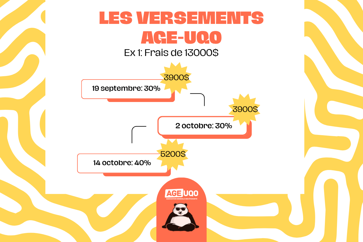 Pour t’aider à gérer tes frais de scolarité, l’AGE te propose un calendrier de paiements avec les Versements AGE-UQO. Une solution en 3 paiements pour respecter la date limite du 17 octobre.